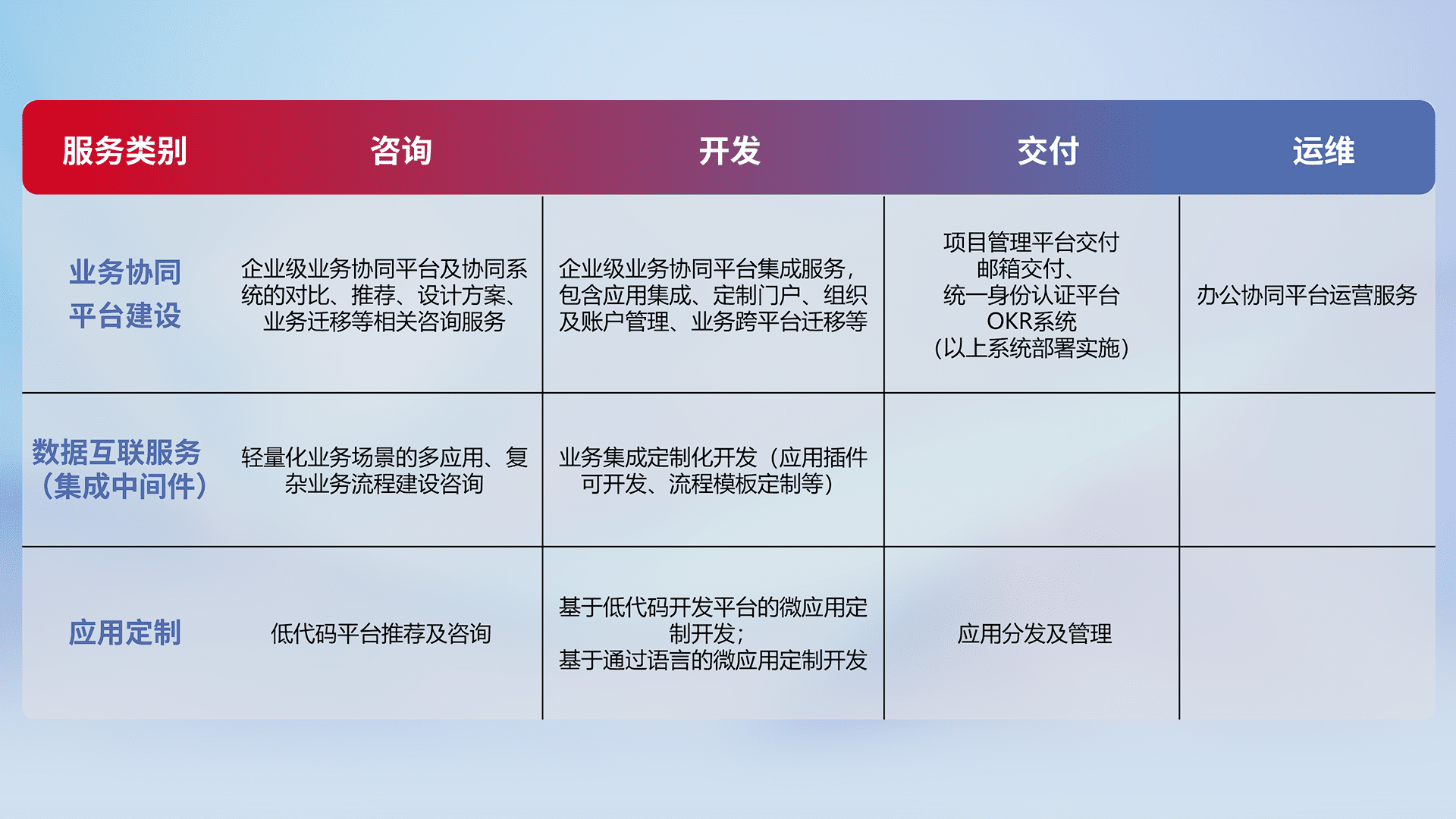针对钉钉、、、、企微、、、IDaas等平台级产品提供产品的规划、、、方案、、交付、、定制化开发等服务,,,,实现如统一协同办公、、智能客户服务、、混合会议管理、、智能数据查询、、、等业务场景,,,实现数字化转型。。。