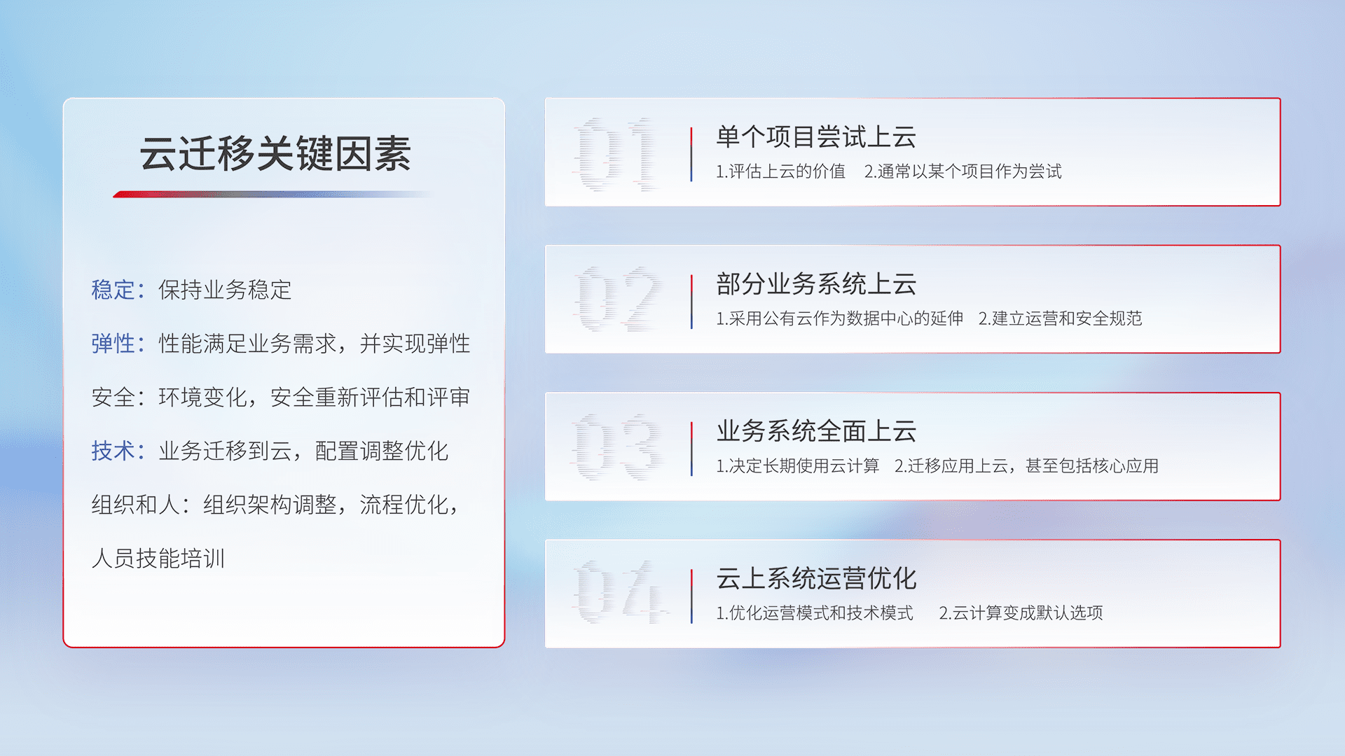 结合实际业务,,,从规划设计、、、云平台选型、、云原生改造、、、数据迁移、、、、集成交付,,迁移全过程为客户识别最佳上云路径,,做好风险识别管理,,设计网络架构、、、身份权限、、、、安全审计合规、、、、操作审计、、、、日志审计、、监控告警策略、、、多站点容灾设计等,,对云上基础设施进行整体规划,,,,提升IT治理水平,,,以满足弹性、、、高可用、、、高性能的需求。。。