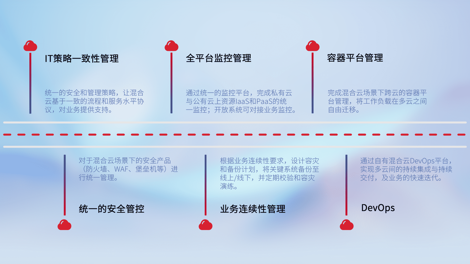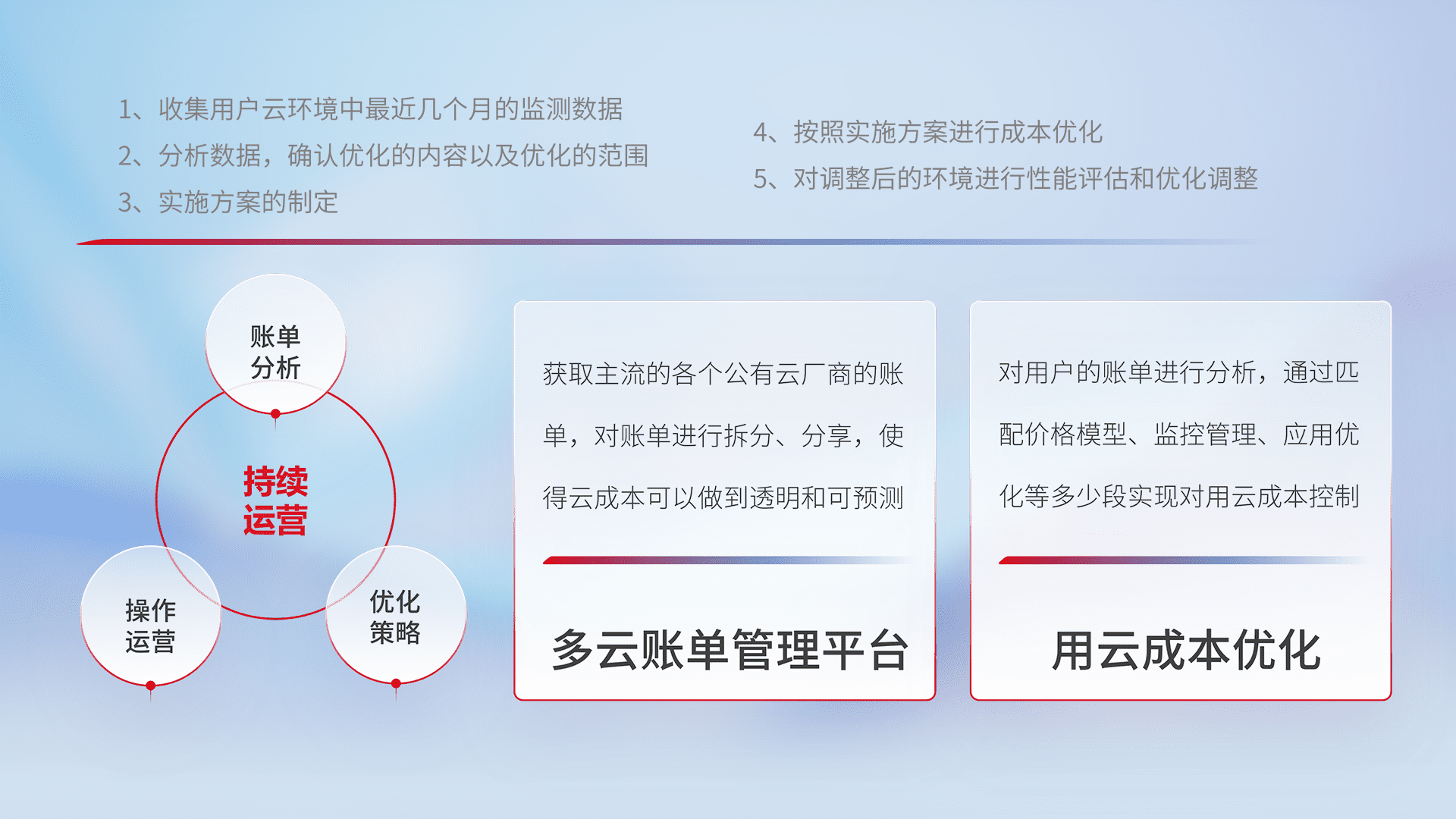通过多云纳管,,,,以统一的资源数据模型把客户的云资源进行抽象和封装,,,,进而实现对多云资源的统一操作,,,保障云资源管理的可靠性、、、、稳定性与可用性。。量身定制化运维内容,,,配置、、、、开发运维、、、补丁管理、、备份、、、、监控、、、认证和访问管理、、审计和日常巡检等,,保障在用云过程中的可靠度,,,,稳定度以及高可用率。。